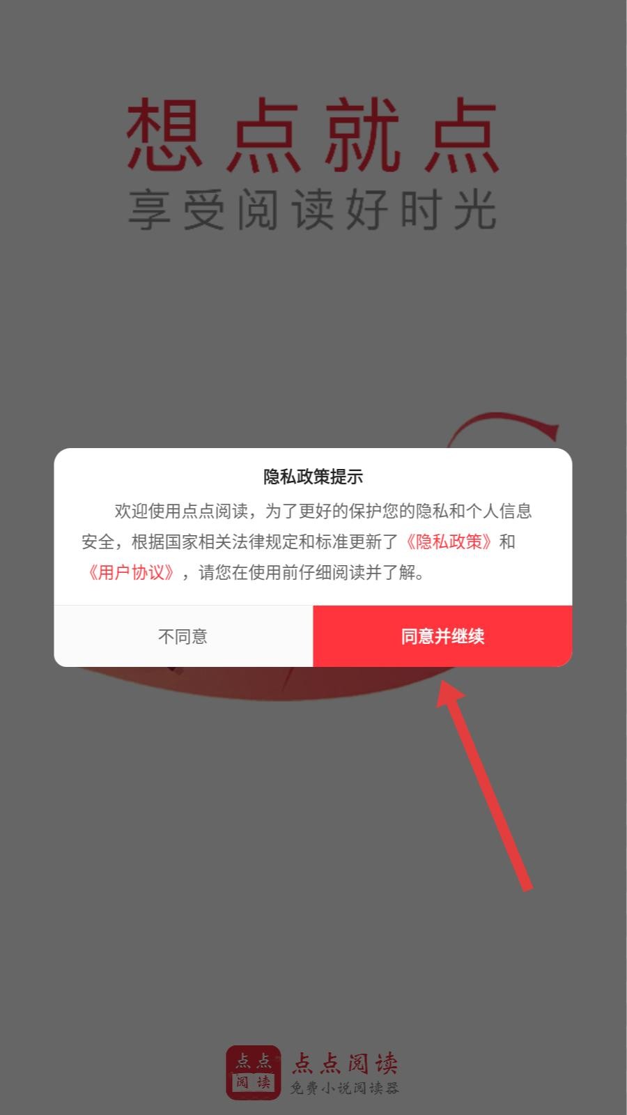 1、打开应用,弹出隐私政策提示弹窗,仔细阅读隐私政策和用户协议内容,点击同意并继续按钮,进入应用书城页面。
