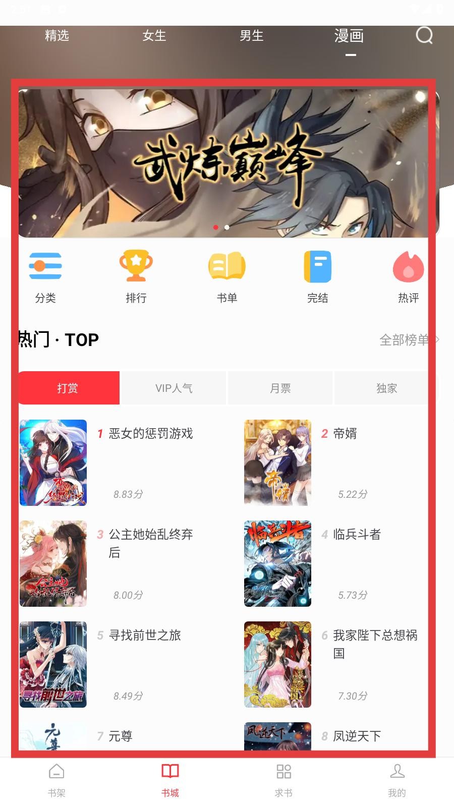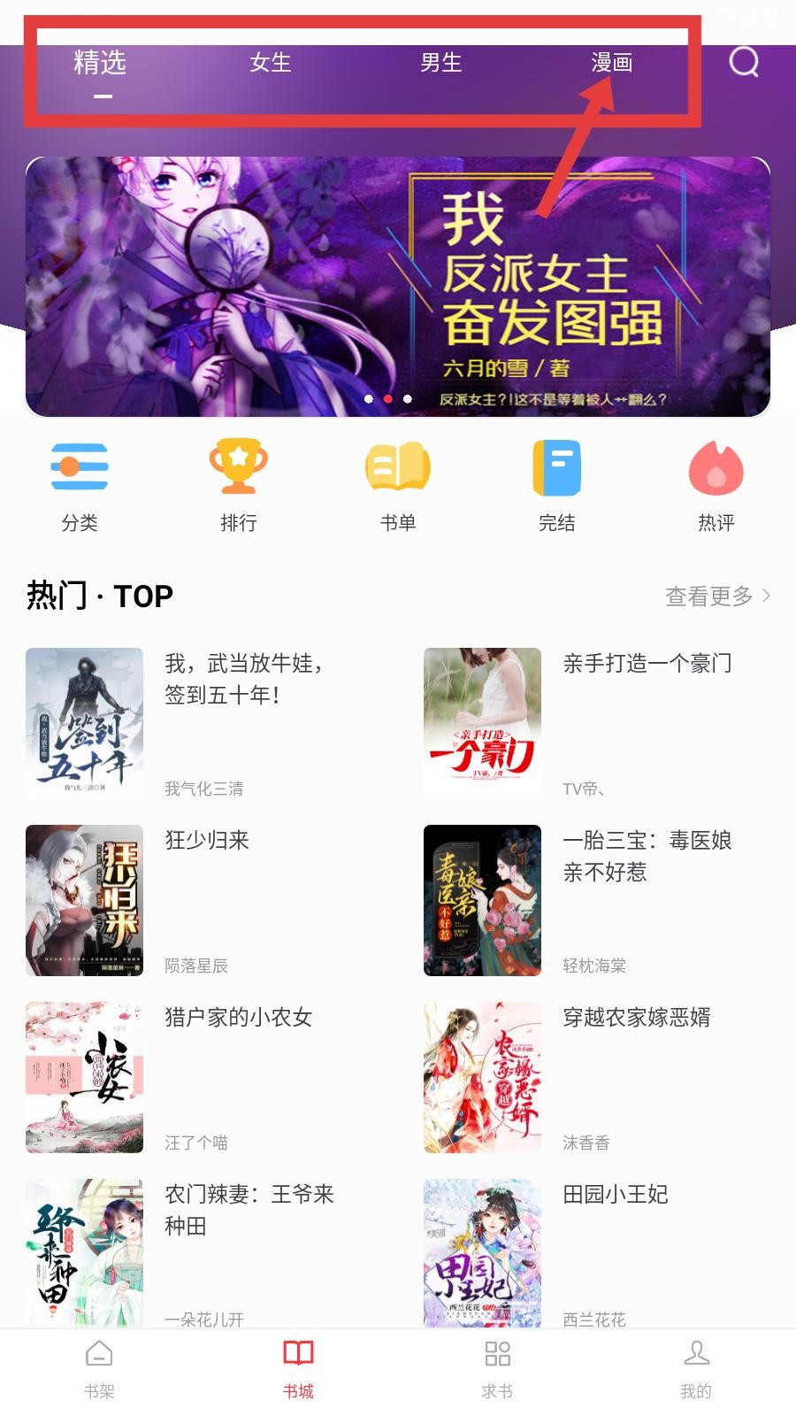 2、在书城页面顶部导航栏,找到漫画选项并点击,切换至漫画分类页面,等待页面加载,确保漫画轮播图、分类图标及热门榜单正常显示。