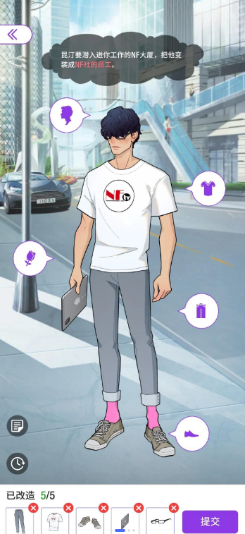 昆汀需要潜入NF大厦,变装成员工进行侦查。你需要为他提供所需的装备,让他顺利完成任务。