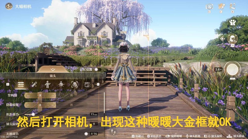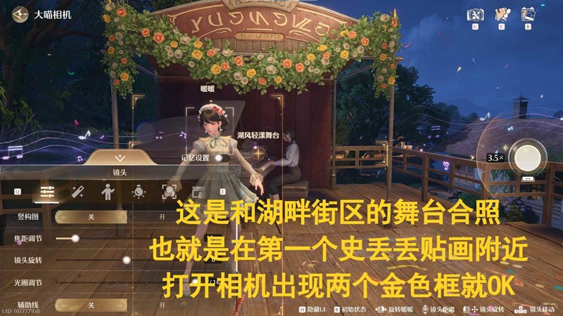 我们去湖畔街区的舞台上(第一个史丢丢旁边舞台),然后打开相机,出现两个金色框框就OK;